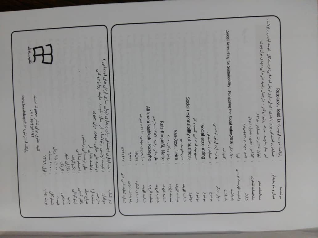 # عنوان نویسنده انتشارات سال انتشار تصویر جلد تصویر شناسنامه 1 حسابداری اجتماعی برای پایداری رضیه علی خانی، مهدی مران جوری نشر حسابدار 1398