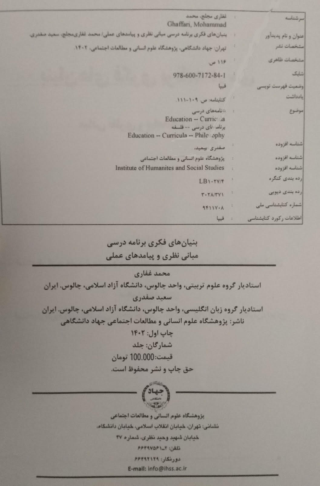# عنوان نویسنده انتشارات سال انتشار تصویر جلد تصویر شناسنامه 1 بنیان های فکری برنامه درسی محمد غفاری مجلج -سعید صفدری پژوهشگاه مطالعات جهاد دانشگاهی کشور 1403