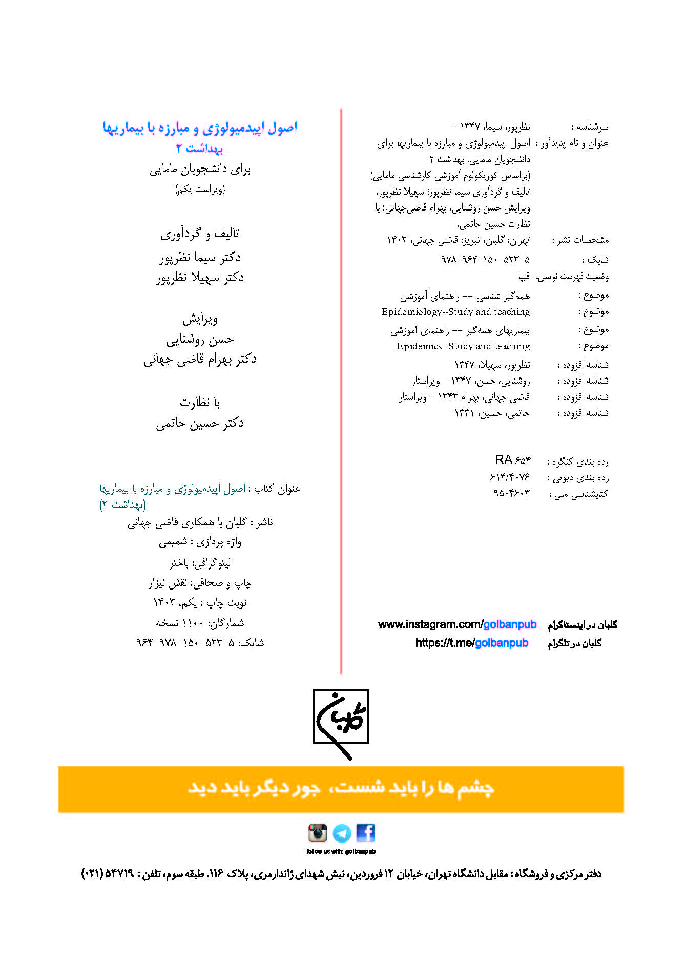 3 بهداشت 2- اصول اپیدمیولوژی و مبارزه با بیماریها برای دانشجویان مامایی (بر اساس کوریکولوم آموزشی کارشناسی مامایی) سیما نظرپور، سهیلا نظرپور گلبان با همکاری قاضی جهانی 1403