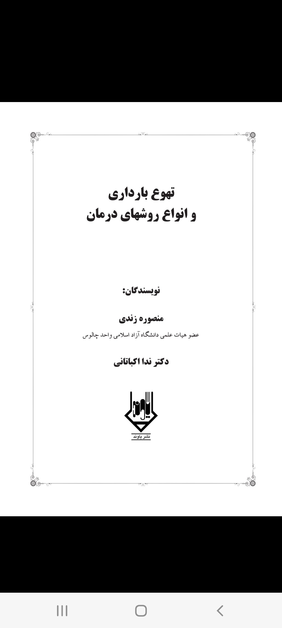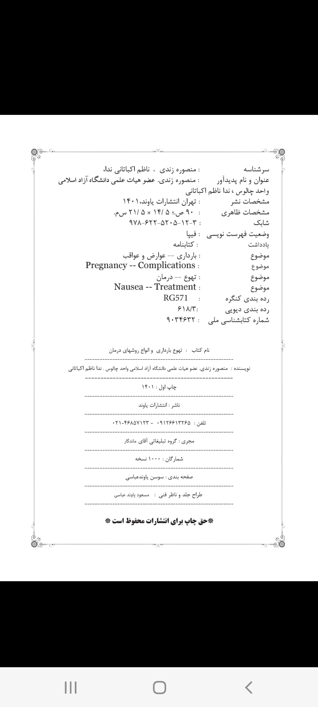# عنوان نویسنده انتشارات سال انتشار تصویر جلد تصویر شناسنامه 1 تهوع بارداری و انواع روشهای درمان منصوره زندی، ندا ناظم اکباتانی تهران، نشر یاوند 1401