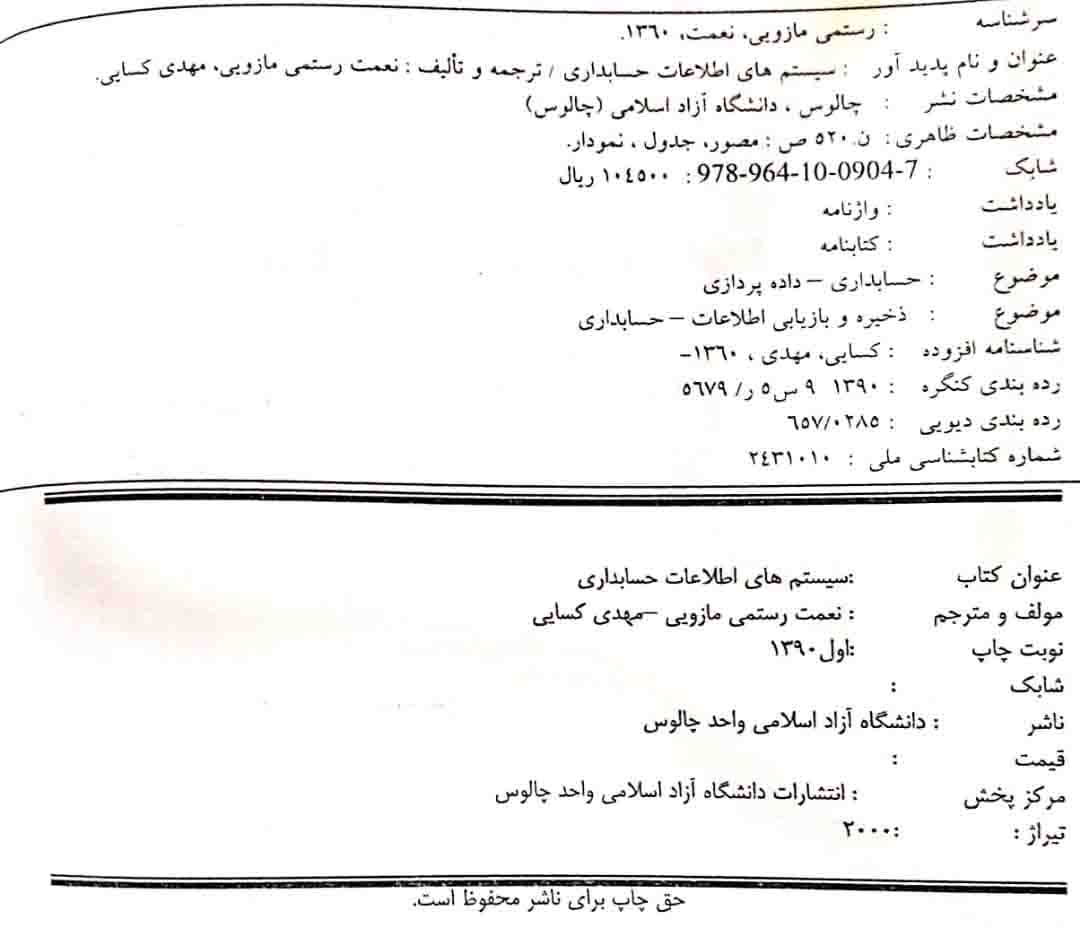 # عنوان نویسنده انتشارات سال انتشار تصویر جلد تصویر شناسنامه 1 سیستم های اطلاعاتی حسابداری نعمت رستمی مازویی دانشگاه آزاد اسلامی واحد چالوس 1390