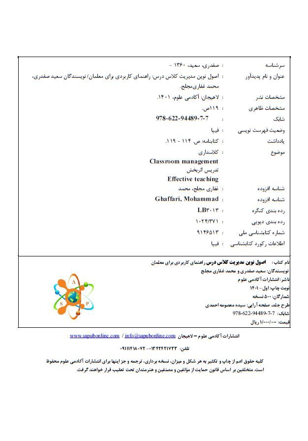 # عنوان مقاله نام نویسندگان نام کنفرانس مکان زمان نحوه ارائه 1 Evaluation of a study skills book: The Regis Study Skills Guide سعید صفدری، سعیده منصوری اولین کنفرانس ملی معلم خبره بابل 1403 سخنرانی 2 Using Poetry as a Source of Input to Improve Language Skills سعیده منصوری، سعید صفدری پنجمین همايش رويکردهاي ميانرشتهاي به آموزش زبان، ادبيات و مطالعات ترجمه دانشگاه فردوسی مشهد 1403 سخنرانی 3 شناسایی عوامل کاهنده انگیزه معلمان ابتدایی غرب مازندران و پیشنهاد راهکارهایی برای مقابله با آنها محمد غفاری مجلج، سعید صفدری هشتمین کنفرانس ملی رویکردهای نوین در آموزش و پژوهش مازندران 1402 سخنرانی 4 بررسی تاثیرات ایمان و اعتقاد به قرآن کریم بر آرامش و سلامت روان انسان سعید صفدری، محمد غفاری مجلج هفتمین همایش بین المللی مطالعات دینی، علوم انسانی و اخلاق زیستی در جهان اسلام تهران 1402 چاپ در مجموعه مقالات 5 واکاوی دیدگاه قرآن کریم درباره موضوع آزادی سیاسی سعید صفدری، سعیده منصوری اولین کنفرانس بین المللی حقوق، علوم سیاسی، سیاست اسلامی و فقه اسلامی موسسه آموزش عالی ادیب مازندران 1402 پوستر 6 فرصت و تهدید فضای مجازی و لزوم جهاد تبیین محمد غفاری مجلج، سعید صفدری همایش ملی جهاد تبیین: راهکارهای مقابله با جریان تحریف چالوس 1402 پوستر 7 بررسی نفوذ معنوی اسلام در هنر و ادبیات اندونزی سعید صفدری، محمد غفاری مجلج اولین کنفرانس بین المللی انقلاب علوم انسانی اسلامی موسسه آموزش عالی ادیب مازندران 1402 سخنرانی 8 Significance of English accents for Iranian EFL learners: Awareness of world Englishes سعید صفدری، سعیده منصوری، رضا مبشرنیا هفتمین همایش بین المللی مطالعات زبان و ادبیات در جهان اسلام تهران 1401 چاپ در مجموعه مقالات 9 A review of eclecticism in postmethod language pedagogy سعید صفدری، رضا مبشرنیا، سعیده منصوری The First Conference on Language Teaching, Translation and Linguistic Studies دانشگاه گیلان 1401 چاپ در مجموعه مقالات 10 Development of L2 motivation theories from Gardner to Dörnyei سعید صفدری، سعیده منصوری، رضا مبشرنیا The First Conference on Language Teaching, Translation and Linguistic Studies دانشگاه گیلان 1401 چاپ در مجموعه مقالات 11 Foregrounding Teachers’ Voices through Action Research in Foreign Language Curriculum Development سعید صفدری، رضا مبشرنیا، سعیده منصوری اولین همایش بین المللی دانش آموزش محتوا در آموزش زبان انگلیسی دانشگاه فرهنگیان مازندران 1401 پوستر 12 باور به اثرات درمانی و شفابخشی دعا در پژوهشهای پزشکی مغرب زمین سعید صفدری، رضا مبشرنیا دومین همایش ملی دعاپژوهی دانشگاه بوعلی سینا همدان 1401 چاپ در مجموعه مقالات 13 دشواری انتقال مفاهیم در ترجمه قرآن و راهکار مقابله با آن سعید صفدری، سعیده منصوری اولین همایش ملی قرآن و ترجمه دانشگاه قم 1400 چاپ در مجموعه مقالات 14 نشانه هایی از نگاه قرآن به علوم طبیعی و زیستی سعید صفدری دومین همایش ملی پژوهشهای میان رشته¬ای قرآن و انگاره¬های علوم زیستی دانشکده علوم کشاورزی و منابع طبیعی ساری 1400 پوستر 15 Technology in Language Education and Communication: Pedagogical Promises and Worries سعید صفدری، رضا مبشرنیا، سعیده منصوری اولین همایش ملی فناوریهای نوین در آموزش زبان انگلیسی مشهد 1400 سخنرانی 16 زبانشناسی و نقد ادبی: مروری بر تضادها و پیوندها سعید صفدری، سعیده منصوری، رضا مبشرنیا هفتمین همایش ملی پژوهش های نوین در حوزه زبان و ادبیات ایران تهران 1400 چاپ در مجموعه مقالات 17 بررسی تاریخی دیدگاه های موجود در برنامه ریزی درسی در آموزش زبان انگلیسی سعید صفدری اولین همایش ملی مطالعات برنامه درسی در هزاره سوم کرمان 1400 چاپ در مجموعه مقالات 18 Global and local issues in ELT syllabus design and curriculum development سعید صفدری، سعیده منصوری، رضا مبشرنیا The First National Conference on New Perspectives in Interpreting and Translation Studies and Teaching English as a Foreign Language دانشگاه بوعلی سینا، پردیس نهاوند 1400 سخنرانی 19 The feasibility of application of SLA research findings to second language curriculum development سعید صفدری The First National Conference on New Perspectives in Interpreting and Translation Studies and Teaching English as a Foreign Language دانشگاه بوعلی سینا، پردیس نهاوند 1400 سخنرانی 20 بررسی انتقادی تاثیرات رویکر